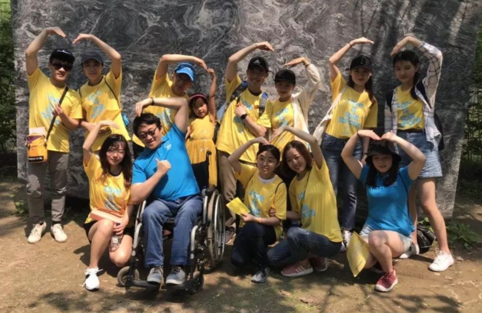 5月11日上午的奥林匹克森林公园,有一群身着黄衫的健走者格外引人注目。他们中,不时有摇着轮椅、拄着拐杖的伙伴,三五成群、有说有笑,在他们的衬衫上有一句共同的口号:Love is still strong!