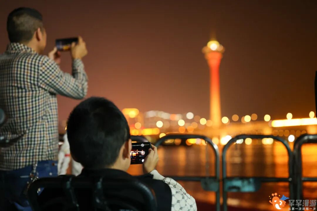 晚上,小伙伴们踏上了港珠澳夜游的游轮,原本沉默的龙龙大喊“我来了”,十分兴奋。大家欣赏着对岸澳门的风景,感受晚风吹拂面庞。