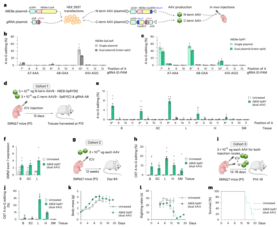 该研究使用了基于SpCas9变体SpRY的腺嘌呤碱基编辑器(ABE8e-SpRY),逆转了脊髓性肌萎缩症(SMA)细胞和小鼠模型的SMN2基因的外显子7的C6T(即A-to-G编辑),从而恢复SMN蛋白水平,提高了小鼠模型的体重、运动能力和存活率。
