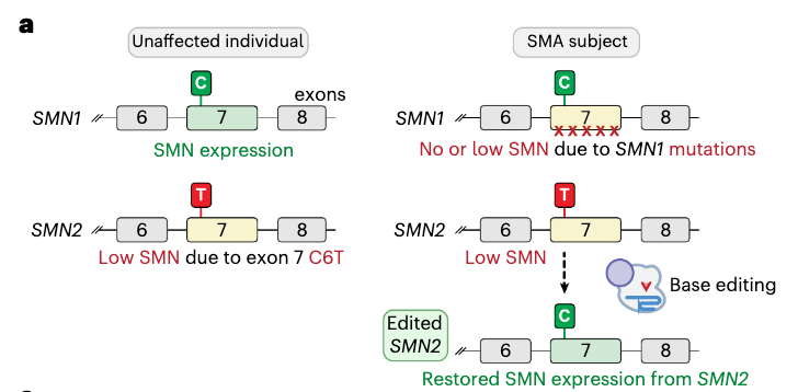 这些结果表明,使用碱基编辑或其他基于CRISPR的基因编辑技术来靶向SMN2基因特定位点并恢复SMN蛋白水平,可能有助于SMA患者的治疗。