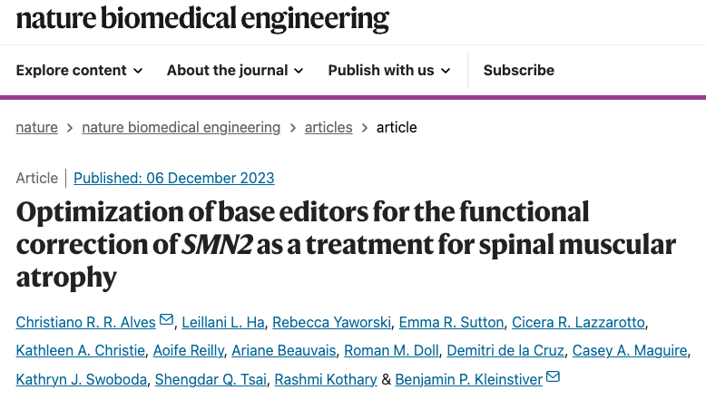 2023年12月6日,美国哈佛医学院和麻省总医院的 Benjamin Kleinstiver团队在 Nature Biomedical Engineering 上发表了题为:Optimization of base editors for the functional correction of SMN2 as a treatment for spinal muscular atrophy 的研究论文。