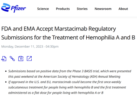 Marstacimab的注册申请基于III期BASIS研究(NCT03938792)获得的有效性和安全性数据。该研究的关键结果在2023年12月9日举行的美国血液学会(ASH)年会期间进行了公布。相比常规预防治疗和按需治疗,marstacimab可使体内不伴抑制物的血友病A及血友病B患者的年化出血率分别降低35%和92%。