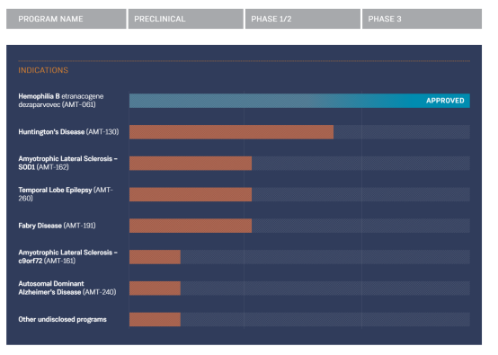 uniQure管线产品中进展最快的是AMT-061,用于B型血友病的适应症在2022年11月已获美国FDA批准,此外,用于肌萎缩性侧索硬化症的AMT-162,用于颞叶癫痫的AMT-260,以及用于法布里病的AMT-191均处于临床阶段。