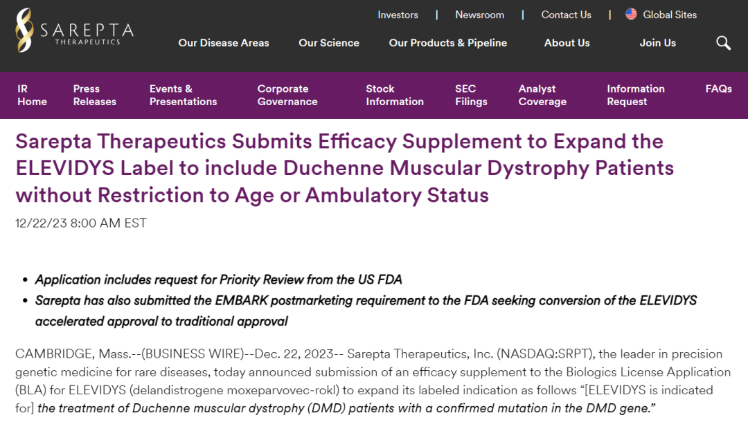 12月22日,Sarepta Therapeutics宣布已向FDA提交Elevidys(SRP-9001,delandistrogene moxeparvovec)用于治疗4-7岁杜氏肌营养不良症(DMD)患儿的补充生物制品许可申请(sBLA)。