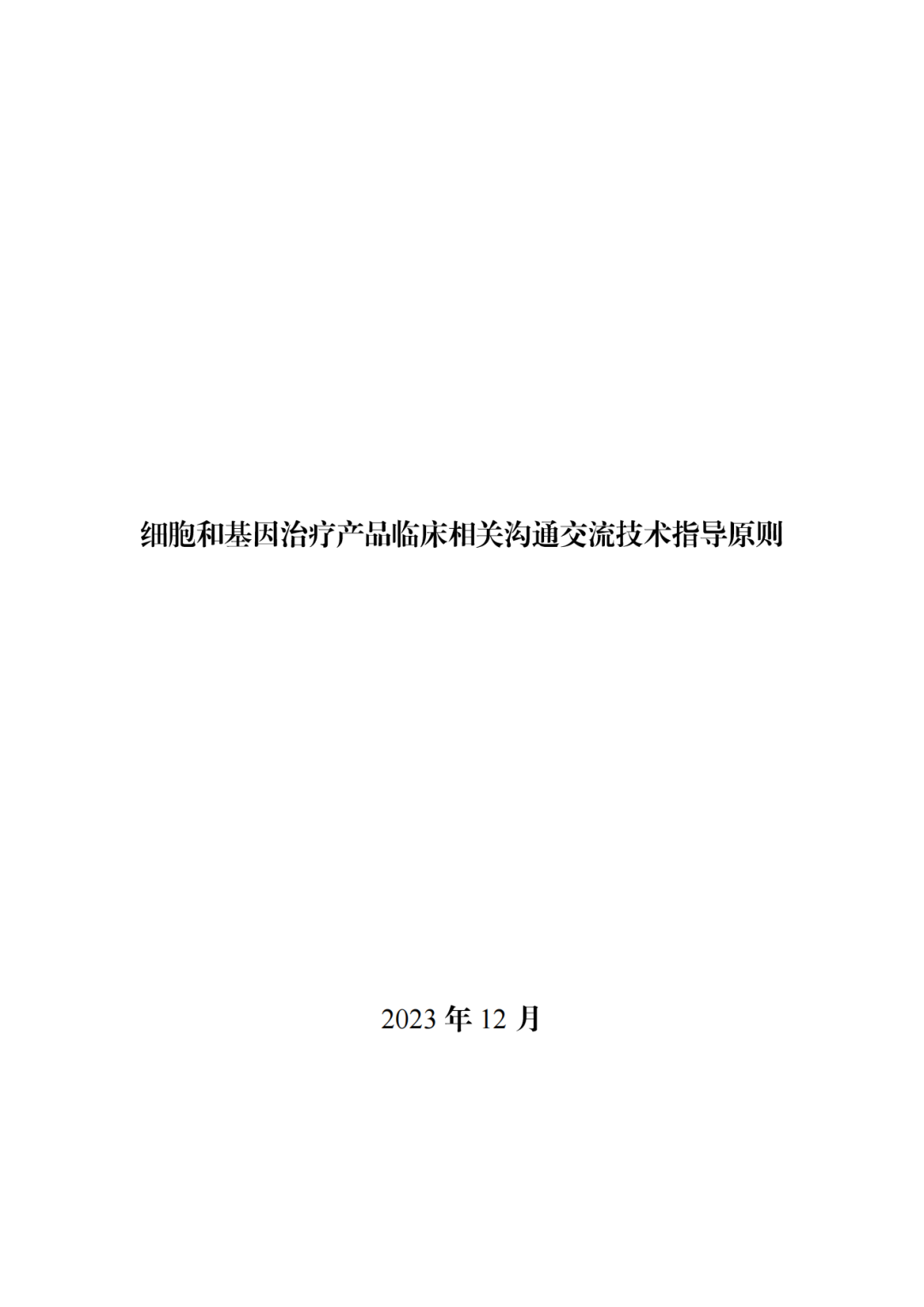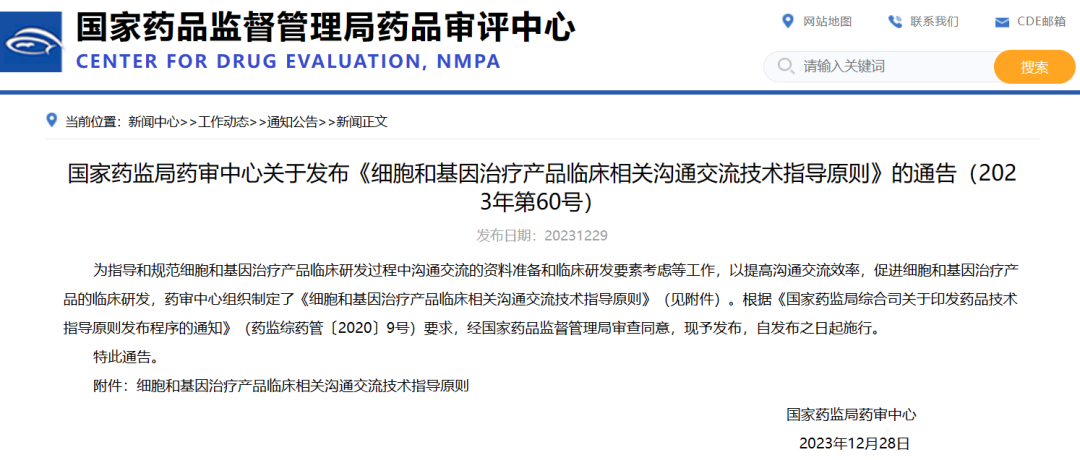 2023年12月29日,国家药监局药审中心关于发布《细胞和基因治疗产品临床相关沟通交流技术指导原则》的通告(2023年第60号)。
