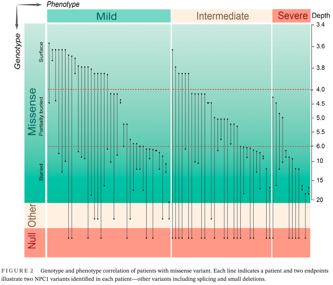 本研究提出了一种新的NPC1基因型-表型相关性,基于残基深度判定NPC1错义突变的严重性有助于在疾病早期对临床分型做出预测,可用于临床实践中的遗传咨询与NPC1患者评估管理。