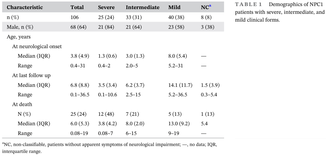 本研究共纳入了106名无血缘关系的NPC1患者。将其按照疾病严重程度分为三种临床表型,其中严重型25例(23%),中间型33例(31%)和轻型40例(38%),另有8名患者在最后一次随访时,尚未出现神经系统损害的征象,属于未定型。
