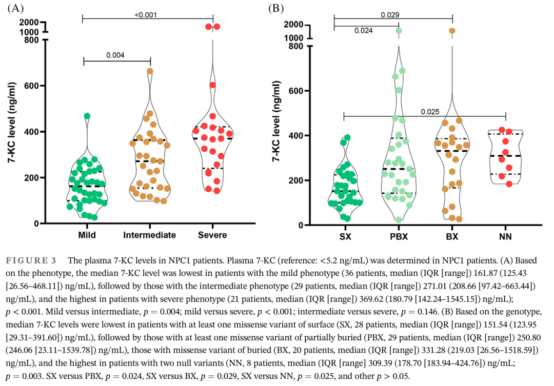NPC1患者血浆7-KC水平的中位数(IQR)为224.01(215.77)ng/ml (参考范围0-5.20 ng/ml)。血浆 7-KC 水平与疾病的严重程度显著相关(p<0.001),轻度表型患者的血浆7-KC水平显著低于中间型(p=0.004)和严重型(p<0.001)患者。此外,血浆7-KC水平也与基因型有关(p=0.003),至少携带一个表面错义变异的患者血浆7-KC水平低于其他基因型的患者(p<0.05)。