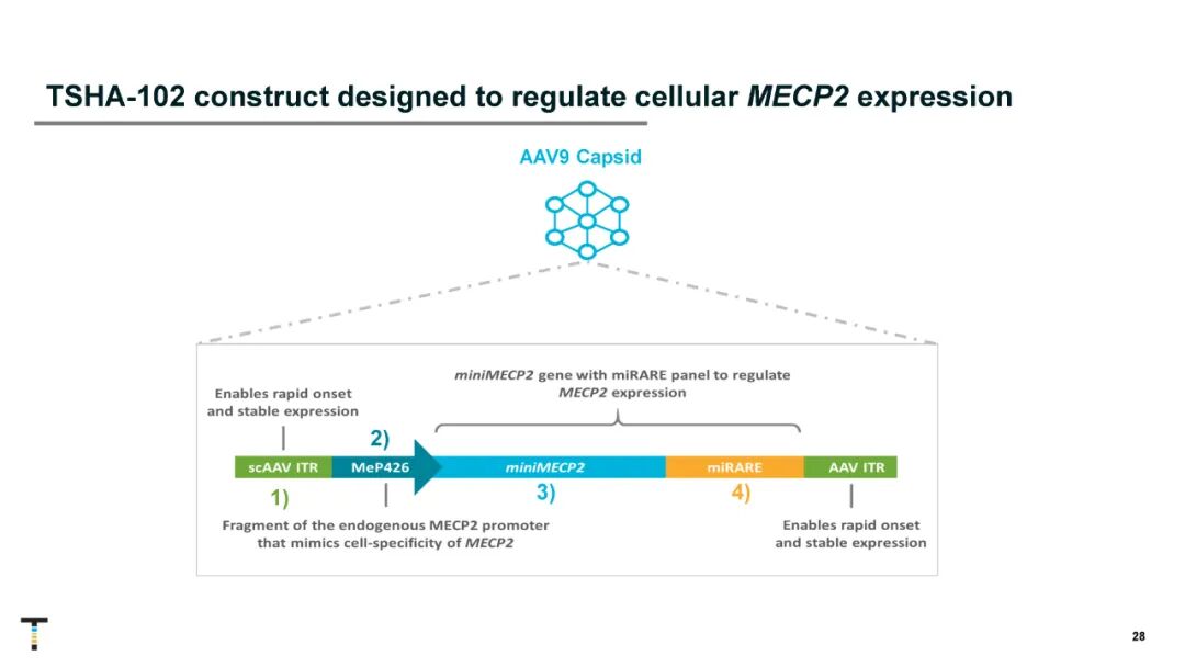 TSHA-102 是一种自我互补的鞘内递送 AAV9 基因转移治疗候选药物,旨在治疗罕见的遗传性神经发育障碍 Rett 综合征。TSHA-102 由神经元特异性启动子 MeP426、miniMECP2 转基因(MECP2 基因的截短体)和 miRNA-响应性自调控元件(miRARE)以及新型 miRNA 靶标组合组成,这些都包装在自我互补 AAV9 中,从而调控 MECP2 基因 的表达。TSHA-102 的设计通过将微小 RNA(miRNA)靶向结合位点插入病毒基因组的 3'非翻译区,防止基因过表达的相关毒性。
