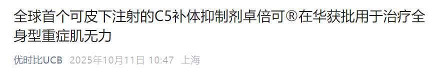 刚刚,全球生物制药公司优时比(UCB)宣布,中国国家药品监督管理局(NMPA)已批准泽卢克布仑钠(商品名:卓倍可)上市许可,与常规治疗药物联合用于治疗抗乙酰胆碱受体(AChR)抗体阳性的成人全身型重症肌无力患者。