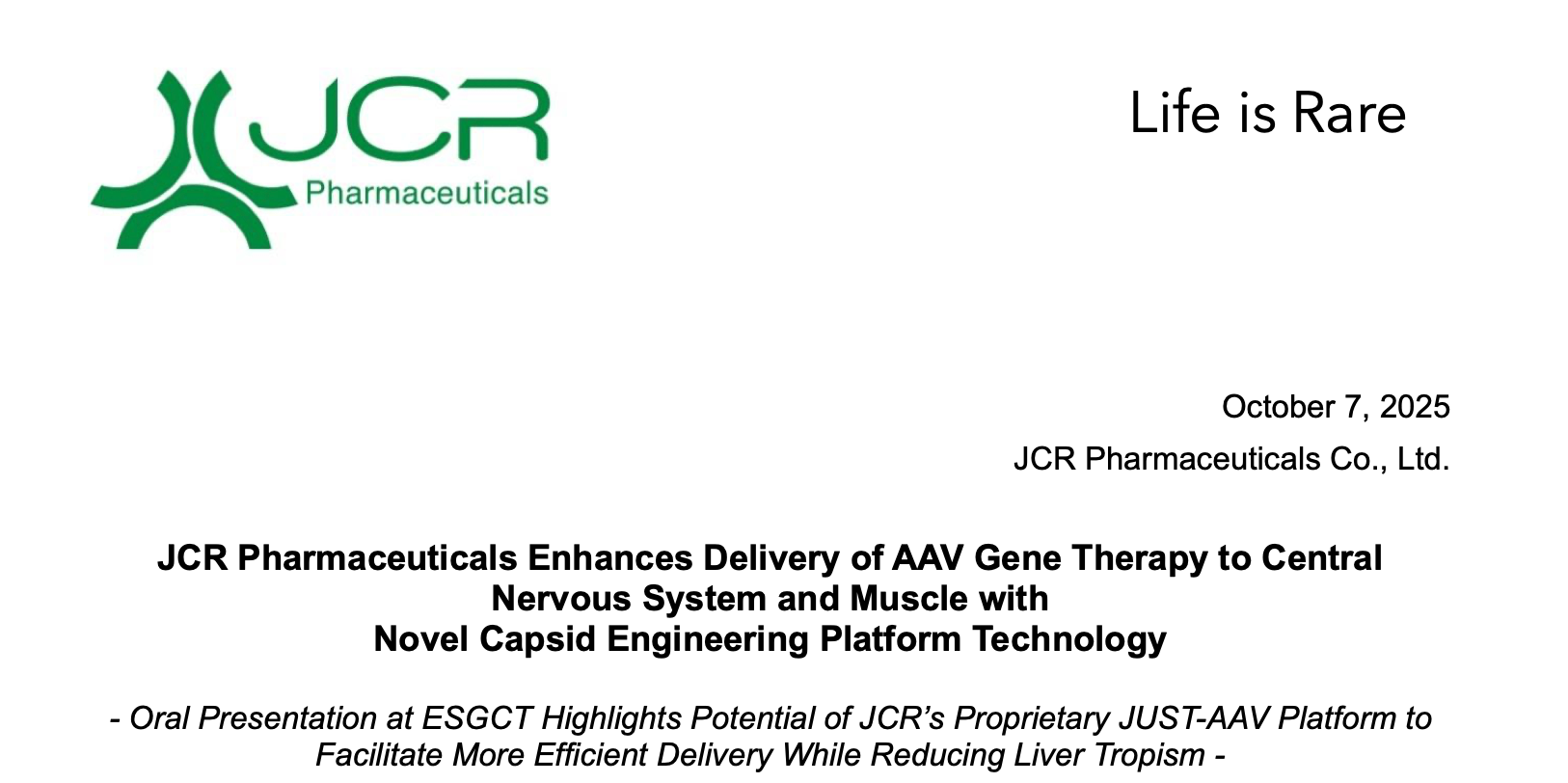 2025年10月7日,日本JCR制药公司(JCR Pharmaceuticals Co., Ltd.)在西班牙塞维利亚举办的欧洲基因与细胞治疗学会(ESGCT)第32届年会上,公布了其专有 JUST-AAV 衣壳工程平台的非临床研究数据。