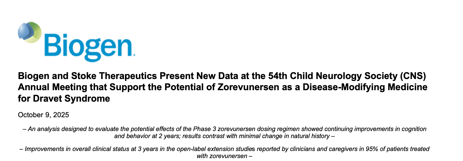 2025年10月9日,渤健(Biogen)与 Stoke Therapeutics 在第54届儿童神经学会(CNS)年会上公布 Zorevunersen 开放标签延长研究(OLE)长期分析结果。这些数据支持Zorevunersen作为Dravet综合征疾病修饰药物的潜力。