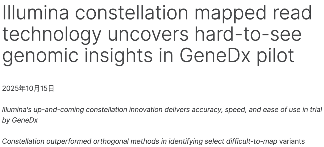 2025 年 10 月 15 日,全球基因测序巨头因美纳(Illumina),宣布联手罕见病基因检测领军企业 GeneDx,正在试点一款全新的基因测序技术 ——星座映射读取技术。