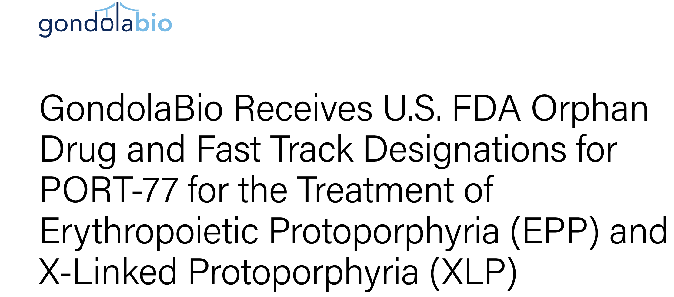 10 月 21 日,生物制药公司 GondolaBio 宣布重磅消息,其附属公司Portal Therapeutics 的在研药物 PORT-77,已成功获得FDA授予的孤儿药认定与快速通道认定,用于治疗红细胞生成性原卟啉症(EPP)和 X 连锁原卟啉症(XLP)这两种罕见病。