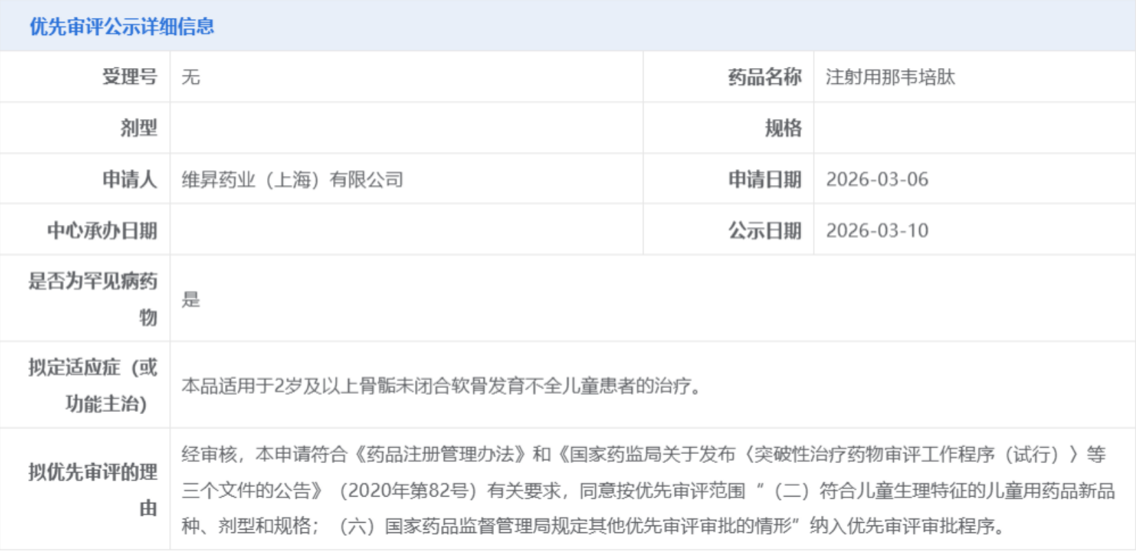 3月10日,国家药品监督管理局药品审评中心(CDE)官网公示,维昇药业递交的注射用那韦培肽(商品名:Yuviwel®)拟纳入优先审评,其适应症为用于治疗2岁及以上骨骺未闭合的软骨发育不全儿童患者。此举标志着这款针对罕见遗传病的创新疗法在中国上市进程迈出关键一步。