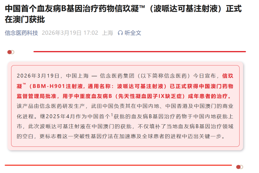 3月19日,信念医药集团宣布,其研发的波哌达可基注射液(商品名:信玖凝)已成功获得中国澳门药物监督管理局批准,用于治疗中重度血友病B(先天性凝血因子IX缺乏症)成年患者。