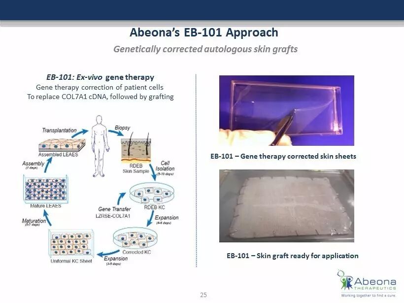 EB-101是一种自体同源、体外转移(ex-vivo)的基因疗法,COL7A1基因被导入自体同源角质细胞以治疗RDEB。1期/ 2期的临床试验正在进行的2期部分(nct01263379)。EB-101最近的临床数据是由该公司的合作者斯坦福大学在皮肤病学会(SID)会议中提出的,并且基于这些临床和药后两年多的跟进,证明了EB-101治疗效果明显,伤口均愈合> 50%。