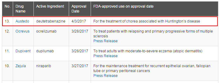 4月3日,FDA(Food andDrug Administration,简称FDA)批准了用于治疗“舞蹈病症状”(与亨廷顿舞蹈症相关)的药物AUSTEDO™(deutetrabenazine;SD-809),AUSTEDO™是FDA批准的首个氘代产品,也是第二个获得FDA批准的针对亨廷顿舞蹈症(Huntington’s disease ,简称HD)的药物,该药物先前FDA已授予孤儿药资格。