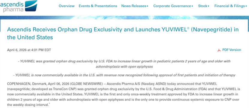4 月 6 日,Ascendis Pharma A/S 正式宣布,其C型利钠肽(CNP)类似物YUVIWEL成功获得美国 FDA 授予的孤儿药独占权,目前已在美国全面实现商业化销售。