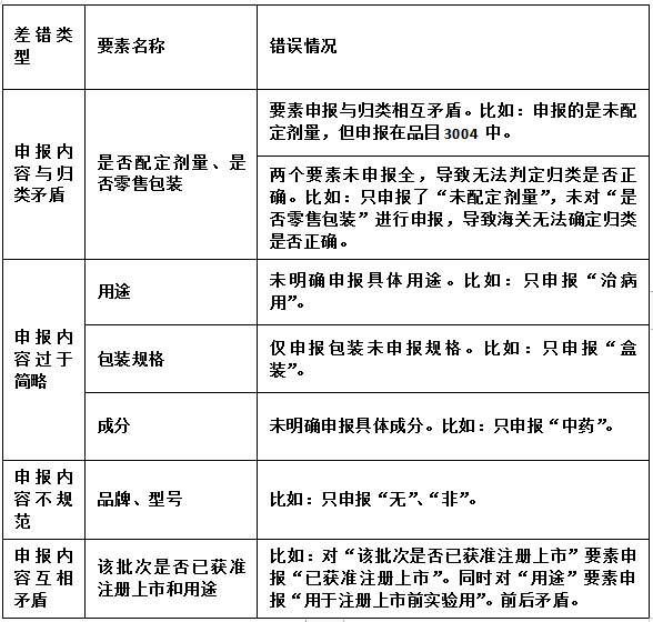 将未获批准上市的药品错误申报在享惠十位编号内。此类差错最为常见,主要是将临床、试验、科研用等未上市药品错误申报享惠(此类药品一般为国外上市或未上市等,由于包装、含量、规格、印刷标识等原因,还未获得中国药品管理部门的上市批准)。针对此问题,海关已在2023年的进出口商品规范申报目录中,对相关税号增加了“该批次是否已获准上市”这一要素。药品规范申报常见差错示例: