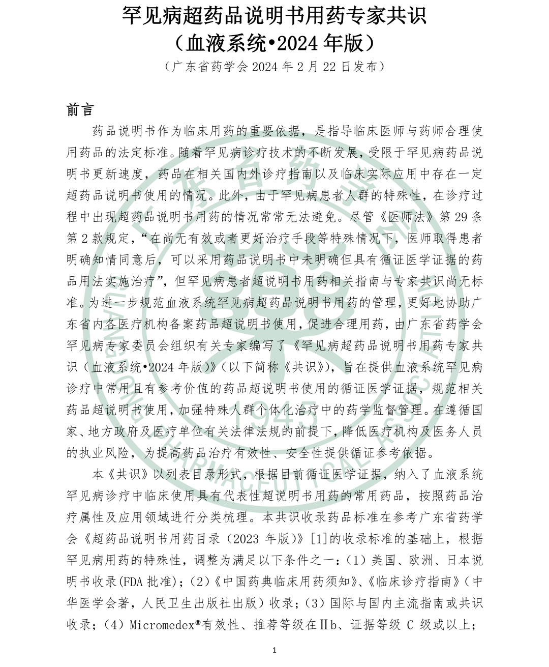 2月22日,广东省药学会发布关于发布《罕见病超药品说明书用药专家共识(血液系统•2024年版)》的通知。