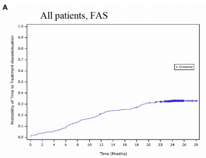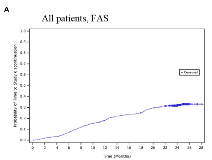 在24个月期间,36.2%的患者中止了研究。研究中止的平均时间为10.1个月。根据Kaplan-Meier估计,前25%患者的研究中止时间为13.4个月(图4)。研究中止的最常见原因是不良事件、患者失访和缺乏疗效。