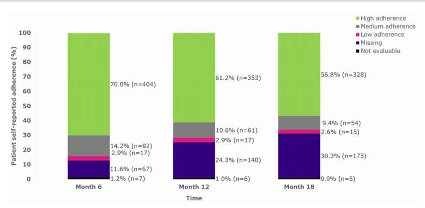 当考虑可评价的非缺失报告时,SC IFNβ-1A的依从性在研究期间保持相对稳定。在预先指定的时间点,具有可评价的非缺失MGLS评分的患者继续报告高依从性(图3)。
