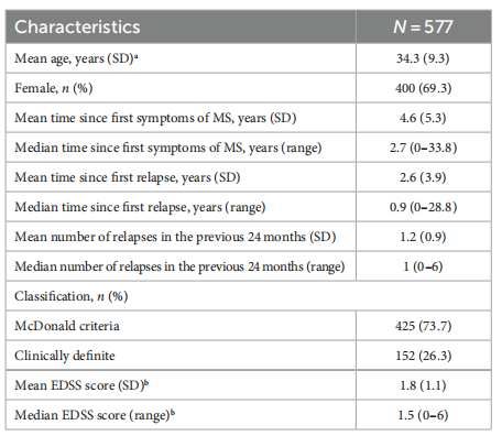 共有577名纳入研究并构成Fas。其中94.1%开始接受SC IFNβ-1A治疗,并被纳入SAF;36.2%的患者中止了研究。