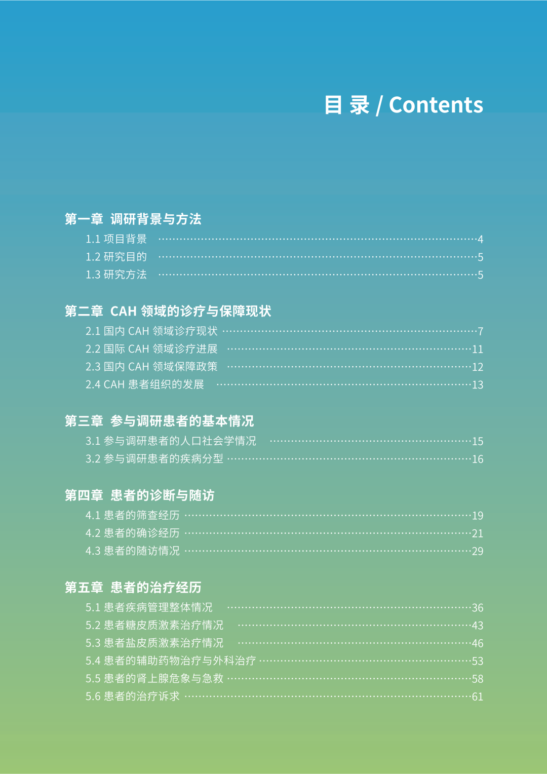 《报告》分为九个章节。在开始部分,报告阐述了此次调研的背景以及我国在CAH领域的诊疗与保障现状;报告的三到五章总结了此次调研的患者基本情况、诊断与随访以及治疗经历;报告六到八章分析了患者的生命质量,患者的社会融入与照护者的负担,以及患者家庭的经济负担;最后报告总结了CAH患者面临的主要问题,提出了针对性的政策建议。