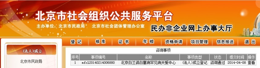 4月9日在北京市社会组织公共服务平台申请获批通过;4月14日验资通过;4月25日北京市民政局接收白塞联盟申请材料。
