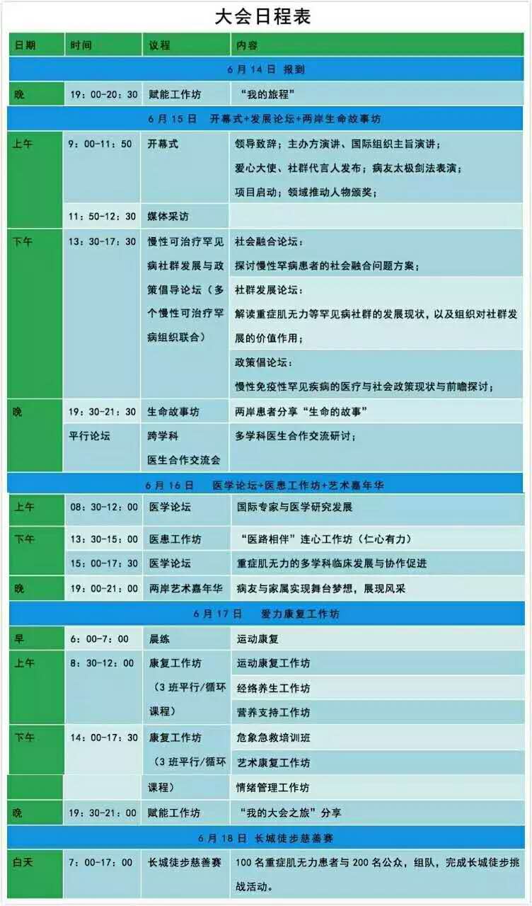 大会还将举办“慢性可治疗罕见病社群发展与政策倡导论坛”、重症肌无力多学科医学高峰论坛、医患连心工作坊、两岸病友艺术嘉年华(文艺表演与T台秀、婚纱秀)、两岸病友生命故事坊、康复工作坊、长城徒步慈善赛多个环节,向社会展现重症肌无力病友的自我风采。
