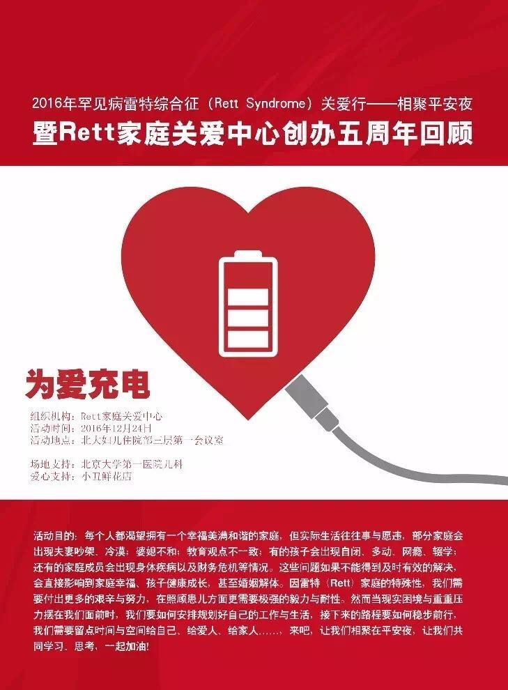 由Rett家庭关爱中心主办的“为爱充电”——2016年罕见病雷特综合征(Rett Syndrome)关爱行活动将于2016年12月24日在北京大学第一医院举行,我们期待您的关注和参与。