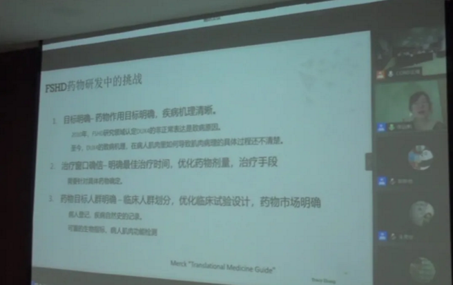张博士通过线上连线的形式分享了关于目前世界范围内的FSHD药物研发的情况,在分享中她提到虽然世界范围内还没有治疗FSHD的药物并且FSHD研发中面临很多挑战,但是随着近几年研究人员对于FSHD疾病的进一步了解,针对FSHD疾病的疗法研究也增加了很多,如进展较快的美国Fulcrum公司的Losmapimod药物目前正在第二期临床试验当中,预计2021年第一季度发布第二期临床试验的结果。