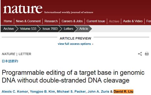 2016年4月,发表在Nature上的一项研究中,Liu教授带领的团队在全球率先发表了可编辑DNA单个碱基的技术——可将DNA中的C转化为U(尿嘧啶,通常存在于RNA中,在DNA中细胞会把它当作T来阅读),也就是实现C•G碱基对向T•A碱基对的转换。不久后,来自日本神户大学的科学家们也在Science杂志上发表了一项类似的成果。