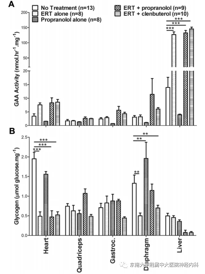 早在2005版《庞贝病的诊断和治疗指南》中,即提醒注意β受体阻滞剂可能导致庞贝病患者死亡。Han SO等使用GAA敲除(GAA-KO)构建的庞贝病小鼠模型和庞贝病患者成纤维细胞进一步开展了研究。研究团队发现在连续给予GAA敲除构建的庞贝病小鼠模型相应处理5周后,与单独使用ERT或ERT联合β受体激动剂克伦特罗干预的小鼠相比,经β受体阻滞剂普萘洛尔+ERT干预的GAA-KO小鼠出现疾病且体重未增加、腓肠肌重量稍减轻,提示肌肉萎缩。左心室重量/体重没有产生有意义的降低,而ERT对心肌肥厚的疗效已被证实,提示普萘洛尔的使用阻碍了ERT对心脏的有效干预(图3)。ERT+普萘洛尔的干预旋转潜伏期,提示GAA-KO小鼠肌肉功能的改善。而相对ERT+克伦特罗的肌肉改善作用,ERT+普萘洛尔不能改善小鼠的悬笼潜伏期。在小鼠肝脏中可以发现ERT+普萘洛尔抑制了ERT本身对心肌和骨骼肌中糖原的清除作用(图4)。以上研究结果表明,在ERT干预期间联合普萘洛尔,虽然可提高肌肉对rhGAA的摄取,但糖原累积明显增加,以心肌、膈肌最甚,不能实现单用ERT治疗的改善作用。