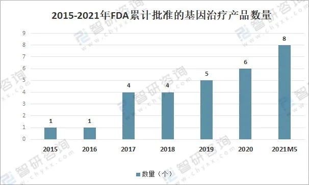 2015-2021年FDA累计批准的基因治疗产品数量