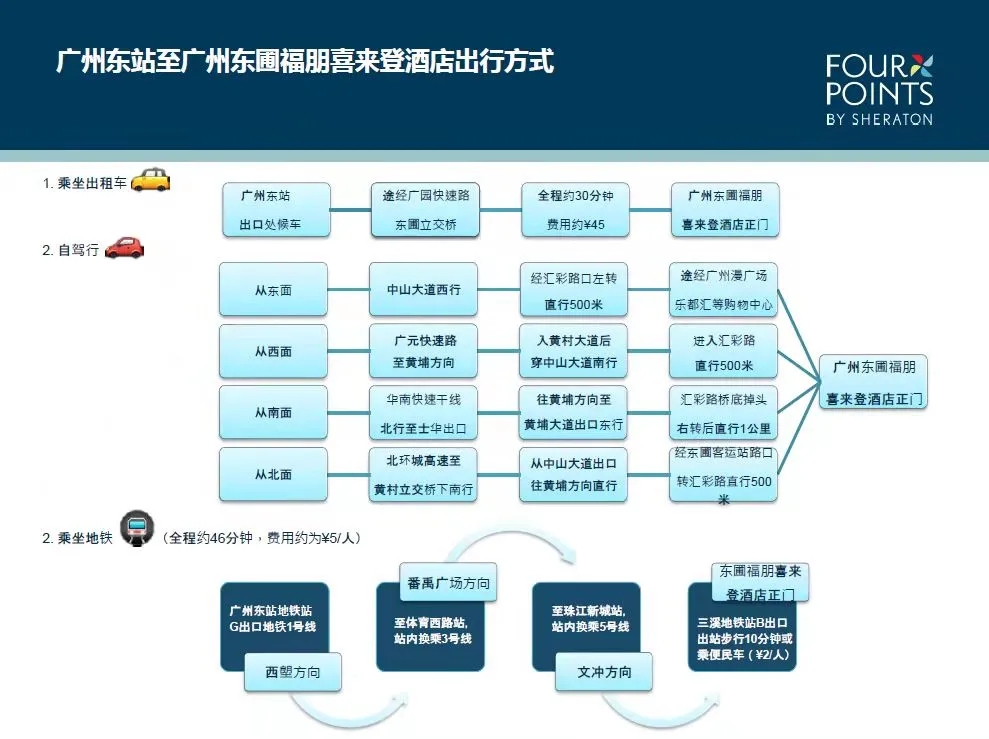 为了方便外地的参会人员到达会议酒店,以下提供从广州东站、广州白云机场到会议酒店的多种出行方式选择,请合理安排好出行时间。
