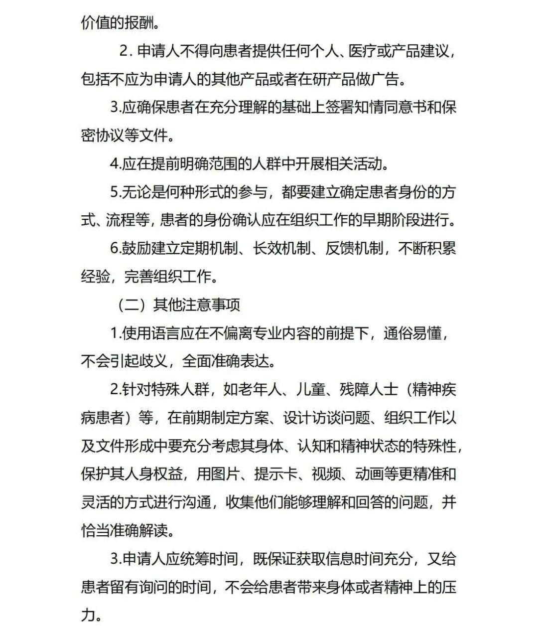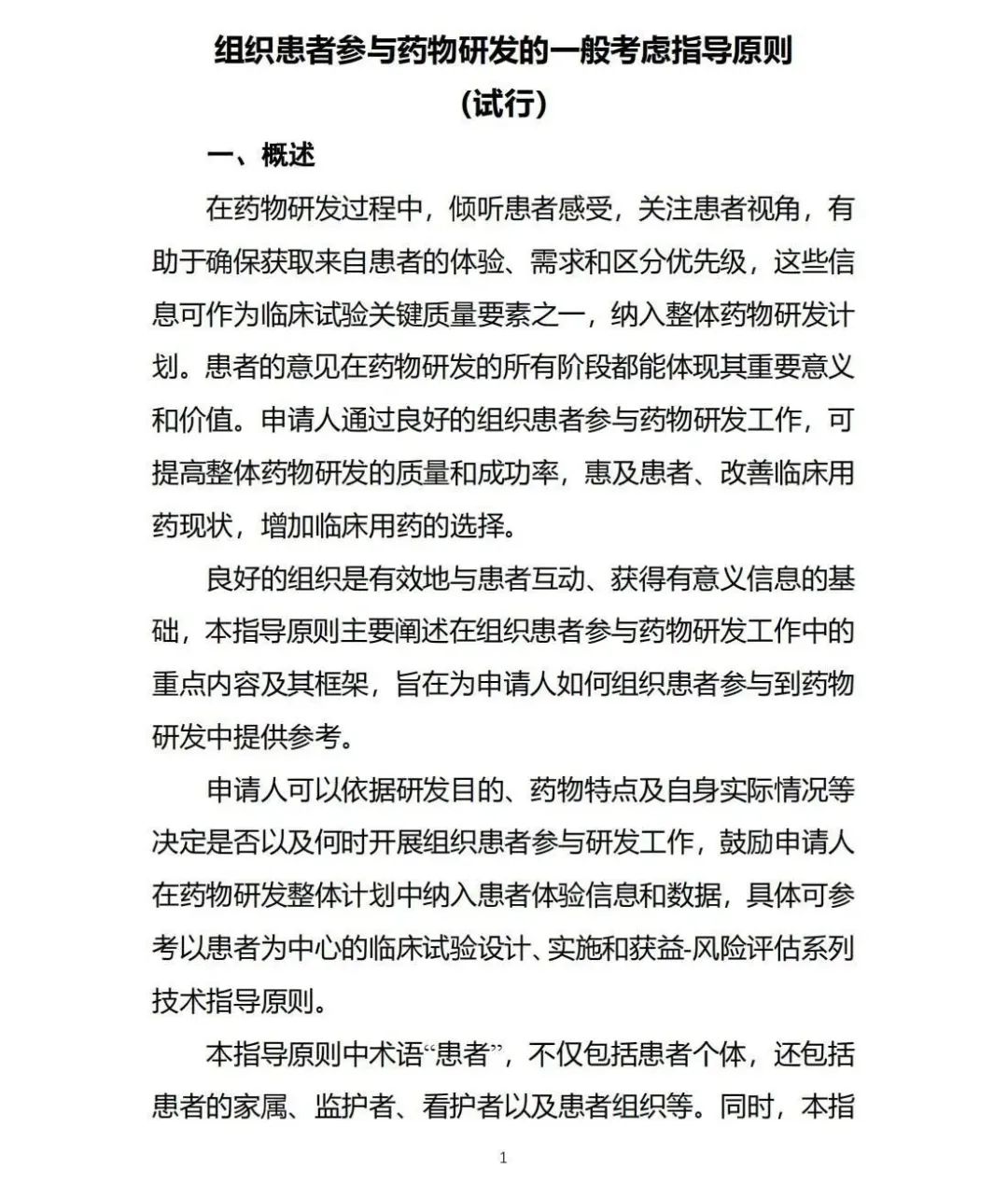 近日,国家药品监督管理局药品审批中心发布了关于发布 《组织患者参与药物研发的一般考虑指导原则(试行)》的通告。指导原则指出患者的意见在药物研发的所有阶段都能体现其重要意义和价值。申请人通过良好的组织患者参与药物研发工作,可提高整体药物研发的质量和成功率,惠及患者、改善临床用药现状,增加临床用药的选择。原则特别提到罕见病药物的研发。