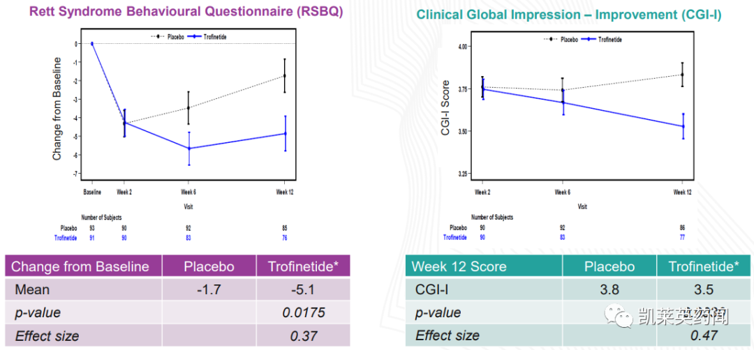 研究显示DAYBUE在两个主要疗效终点上,即第12周与基线相比,Rett 综合症行为问卷 (RSBQ) 总分(p=0.018)和临床整体印象(CGI-I) 量表评分(p=0.003)变化,与安慰剂相比均显示出具有统计学意义的显着改善。RSBQ 是看护者对Rett综合征患者,包括发声、面部表情、眼睛注视、手部动作(或刻板印象)、重复行为、呼吸、夜间行为和情绪等方面的评估;CGI-I是由医生评估患者是好转还是恶化。