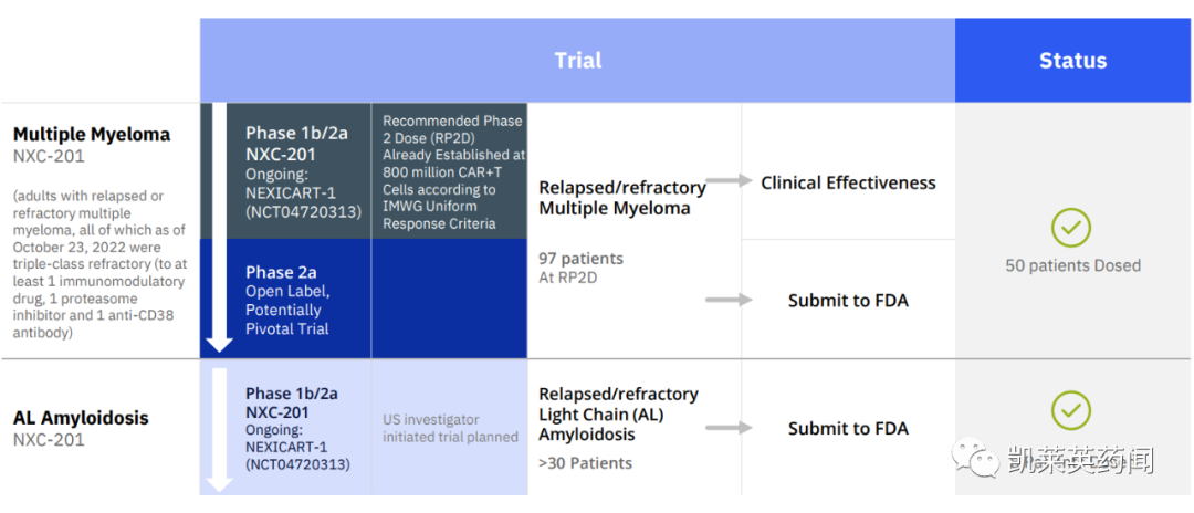 NEXICART-1是一项正在进行的1b/2期开放标签研究,评估NXC-201在成人复发或难治性多发性骨髓瘤和AL淀粉样变性中的安全性和有效性。该研究的 1b 期部分是验证药物的安全性,并确认 NXC-201 的最大耐受剂量( MTD )和 2 期剂量;2期部分将以总生存期、无进展生存期和反应率为终点,评估NXC-201的疗效和安全性。