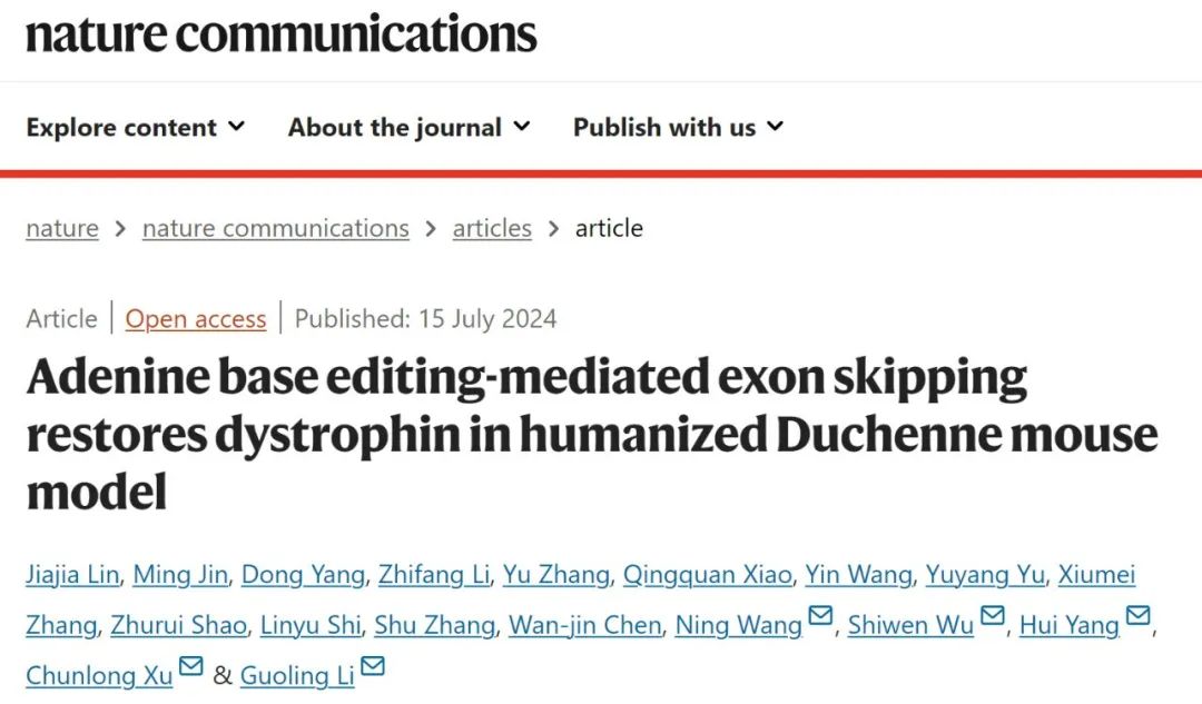 7月15日,福建医科大学附属第一医院王柠教授和陈万金教授团队、辉大基因杨辉教授等团队联合在Nature Communication在线发表福建医科大学附属第一医院第一署名单位文章“Adenine base editing-mediated exon skipping restores dystrophin in humanized Duchenne mouse model(单碱基编辑技术介导外显子跳跃恢复人源化dmd模型小鼠dystrophin 蛋白表达)”,该研究利用双腺相关病毒(AAV)载体在人源化DMD小鼠模型递送ABE碱基编辑器,剪切位点突变介导外显子跳跃,在小鼠体内实现高效且稳定的dystrophin蛋白表达,并成功地将DMD小鼠的肌肉功能提升至接近野生型小鼠的水平。该结果表明,这种方式的基因编辑治疗杜氏肌营养不良症更加有效,为DMD的临床治疗取得了新进展。