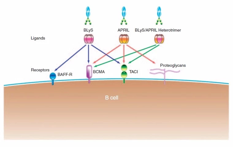 在B细胞膜上有3个受体,分别是BAFF-R、BCMA和TACI,其中TACI还有另外一个ligand即APRIL。