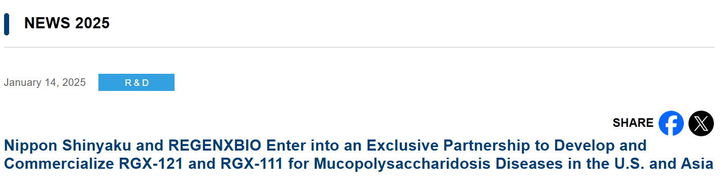 2025年1月14日,REGENXBIO公司与Nippon Shinyaku(日本新药株式会社)宣布了关于AAV基因治疗领域的一项独家合作计划,旨在开发和商业化用于治疗黏多糖贮积症II型(MPS II)的基因疗法RGX-121以及用于治疗黏多糖贮积症I型(MPS I)的基因疗法RGX-111。