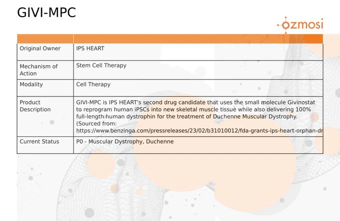 当前市场对 BMD 和杜氏肌营养不良症(DMD)的治疗主要集中在基因疗法,但现有疗法只能提供部分长度的合成抗肌萎缩蛋白,且无法在肌肉退化后再生新的肌肉组织。相比之下,GIVI-MPC 基于多能干细胞技术(iPSC),不仅能够生成全长度抗肌萎缩蛋白,还能直接重建新肌肉,从根本上改变疾病进程。这种颠覆性创新为目前的治疗困境提供了突破口。