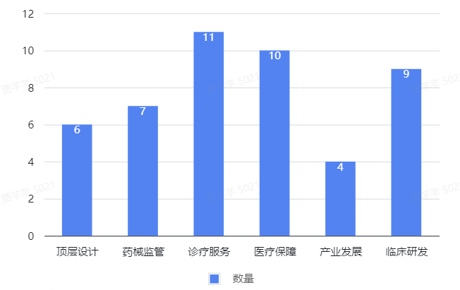 从政策类别来看,今年各省市发布的诊疗服务和医疗保障政策数量较多,其次是临床研发和药械监管方面。