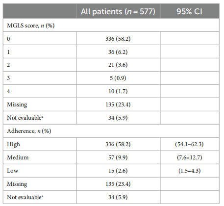 由于这项非国际研究是开放性和观察性的,因此对结果评估的控制有限。这可能会导致潜在的招生和信息偏差。为了最大限度地减少这些研究限制,使用了标准化的病例报告表、系统的现场培训和监测以及其他指导文件,以确保数据收集的一致性。然而,相对较高的研究和治疗中断率可能影响了结果。为了限制缺失数据对MGLS评分的影响,进行了敏感性分析。此外,所接受治疗的可变性可能会限制结果解释的可靠性。