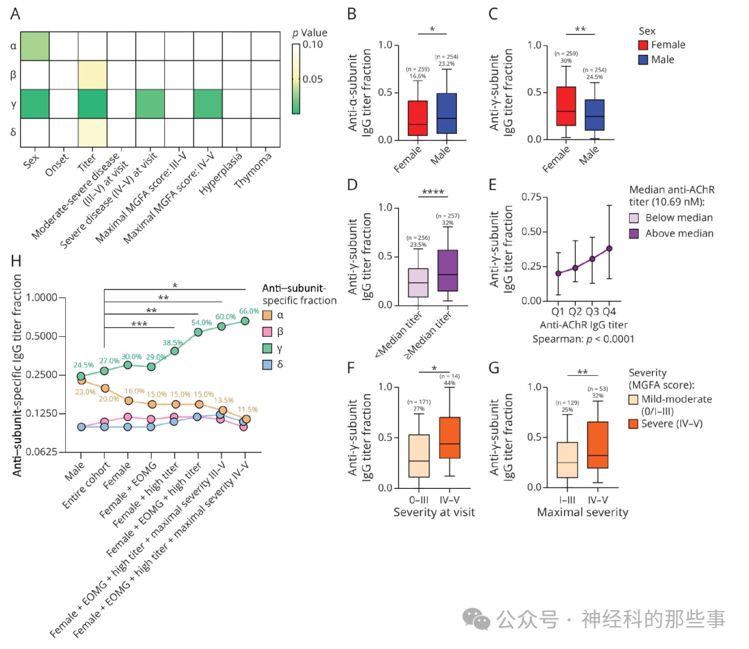 图:(A) 显著性矩阵显示针对不同AChR亚基的自身抗体免疫优势在根据临床特征分组的患者之间的潜在差异的p值。Y轴表示不同的AChR亚基。X轴表示进行比较的临床特征:性别,男性对女性;发病类型,EOMG(早发型重症肌无力)对LOMG(晚发型重症肌无力);抗体滴度,<中位数对≥中位数;就诊时病情中重度,MGFA分级0–II对III–V;就诊时重度,MGFA分级0–III对IV–V;最大MGFA分级III–V,I–II对III–V;最大MGFA分级IV–V,I–III对IV–V;胸腺增生,有对无;胸腺瘤,有对无。比较采用Mann-Whitney检验。显著性比较(p<0.05)以绿色表示,边缘显著性比较(0.05≤p<0.1)以黄色表示,非显著性比较(p≥0.1)以白色表示。(B和C) 箱线图显示男性和女性在α(B)和γ(C)AChR亚基特异性滴度分数的中位值差异。(D) 箱线图显示滴度较低(<队列中位数)与较高(≥队列中位数)患者中γ亚基特异性滴度分数的差异。(E) 以前述分析基础上,按抗AChR IgG滴度四分位进一步分层。圆点代表中位值,须状线表示四分位范围。(F和G) 箱线图显示在就诊时轻中度(MGFA评分0/I–III)与重度(MGFA评分IV–V)患者间(F)以及最大历史病情分值时(G)γ亚基特异性滴度分数的差异。(B–D,F和G) 所有箱线图均显示中位值,箱体表示四分位范围,须状线表示10%–90%百分位数。统计显著性采用Mann-Whitney U检验。(H) 图表显示具有不同累积临床特征的患者亚组的抗亚基特异性IgG滴度分数中位值。
