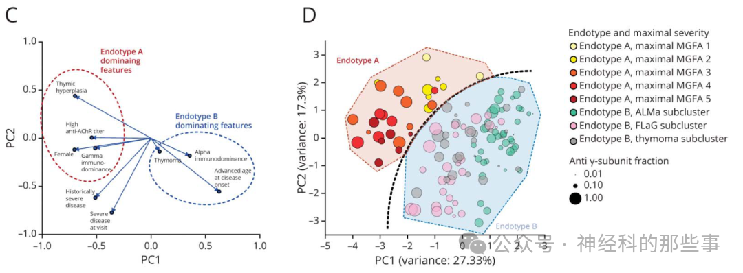 图:(C)特征向量分布显示特征聚类,提示存在2个不同的MG亚组:内表型A(棕色)和内表型B(蓝色)。(D) 主成分分析(PCA)散点图展示了经过转换的患者数据。虚线表示内表型A与内表型B之间的分界线,分别用半透明的棕色和蓝色多边形进行阴影处理。每个圆圈代表一名患者。对于内表型A,圆圈颜色从浅黄色到深红色,表示MGFA最大严重程度评分的升高。对于内表型B,圆圈颜色反映子簇归属(粉色:FLaG;青绿色:ALMa;灰色:与胸腺瘤相关)。圆圈的大小表示γ-亚基特异性抗体分数的大小。