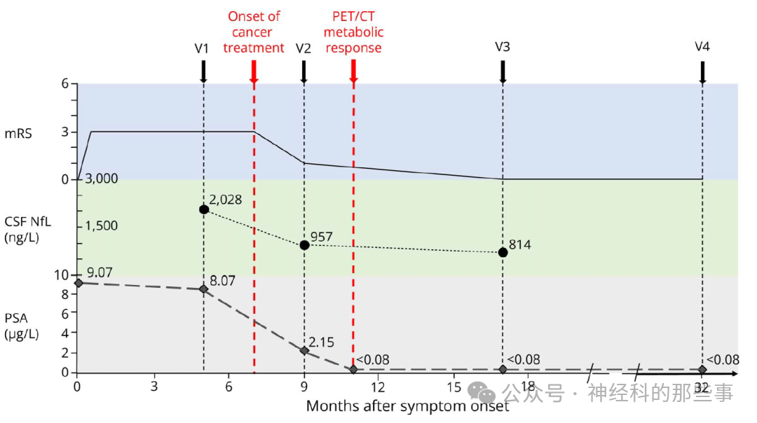 图:功能状态(mRS)及辅助检查( 脑脊液 NfL、PSA)随时间的变化,均以症状出现和肿瘤治疗开始为参照。V1 为首次就诊,V2 为第二次就诊,V3 为第三次就诊,V4 为第四次就诊于神经内科,分别为症状出现后第5、9、17和32个月。亚急性发病表现为 mRS 在大约两周内迅速升高。V1 时 mRS 为3分(中度残疾),V2 时为1分(无显著残疾,但仍存在一些症状),V3 与 V4 均为0分(无症状)。症状改善始于肿瘤治疗开始前后。脑脊液 NfL 和 PSA 水平随随访呈下降趋势。mRS = 改良 Rankin 评分量表;NfL = 神经丝轻链;PSA = 前列腺特异性抗原。