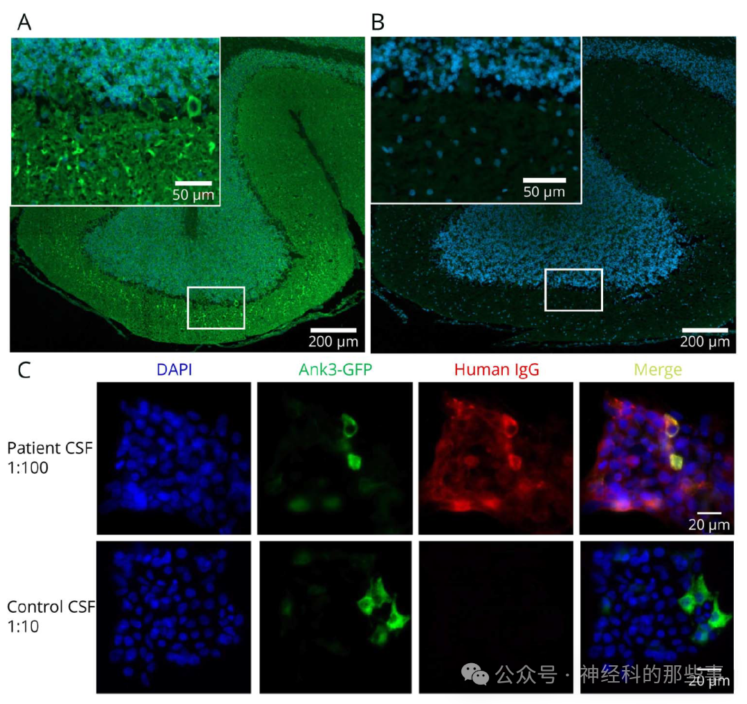 图:(A 和 B)大鼠脑切片的免疫组化染色,分别使用患者脑脊液(A)和对照脑脊液(B)。在小脑分子层的树突可以观察到强烈标记,同时也可见小脑颗粒层的标记。(C)抗体靶点通过细胞实验得到验证。仅患者脑脊液与瞬时转染有大鼠Ank3全长编码质粒的人胚肾293T细胞发生阳性反应。